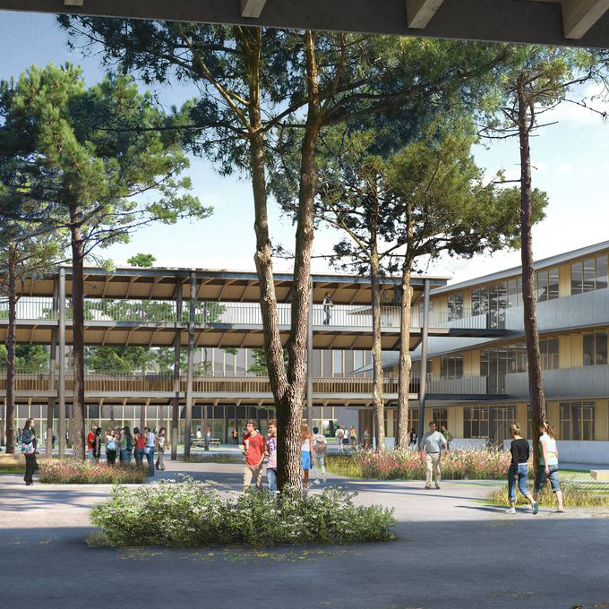 D’une surface totale de 26 000 m2 et conçus par le groupement d’architectes Atelier Mazières, Agence Ragueneau-Roux et Agence Arotcharen, les bâtiments en ossature bois accueilleront leurs premiers lycéens à la rentrée de septembre 2023 et les premiers collégiens à la rentrée de septembre 2024.