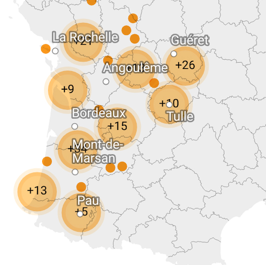 Pour consulter les informations de chaque événement, passez la souris sur les points de géolocalisation sur la carte. Possibilité de zoomer lorsque plusieurs événements sont regroupés.