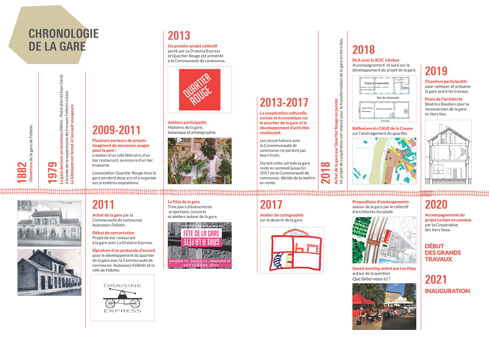 Ce n’est qu’en 2009, soit 30 ans après la fermeture de la gare à l’accueil des passagers, que des acteurs du territoire s’intéressent à ce bâtiment et réfléchissent à de nouveaux usages possibles. C’est à partir de cette année-là que Quartier Rouge se projette dans ce lieu en y organisant plusieurs évènements. Puis, en 2018, la gare est de nouveau en vente ; Quartier Rouge en devient propriétaire et monte alors le projet de la Gare en commun, véritable projet de territoire.