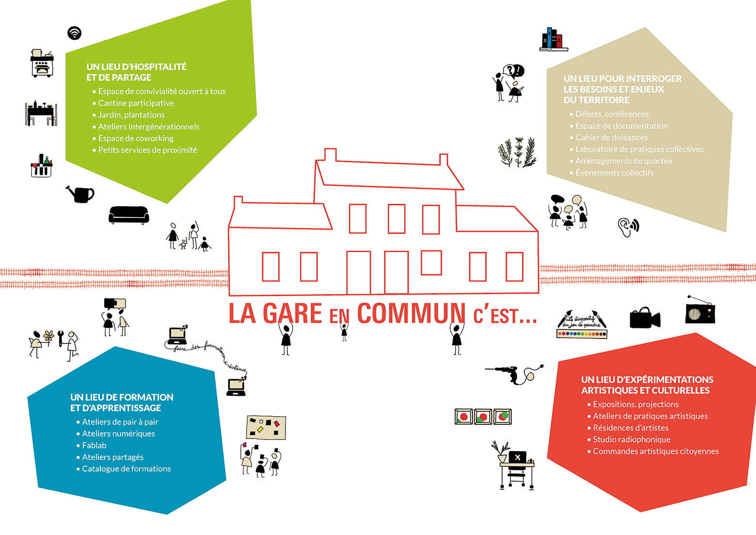 Ce projet veut faire revivre le site de la gare comme nouvel espace public, au sens d’espace de vie, de circulation, de diversité, d’échanges et de travail en commun. Un lieu ouvert où il est possible de se retrouver, de s’interroger et de fabriquer des choses ensemble.