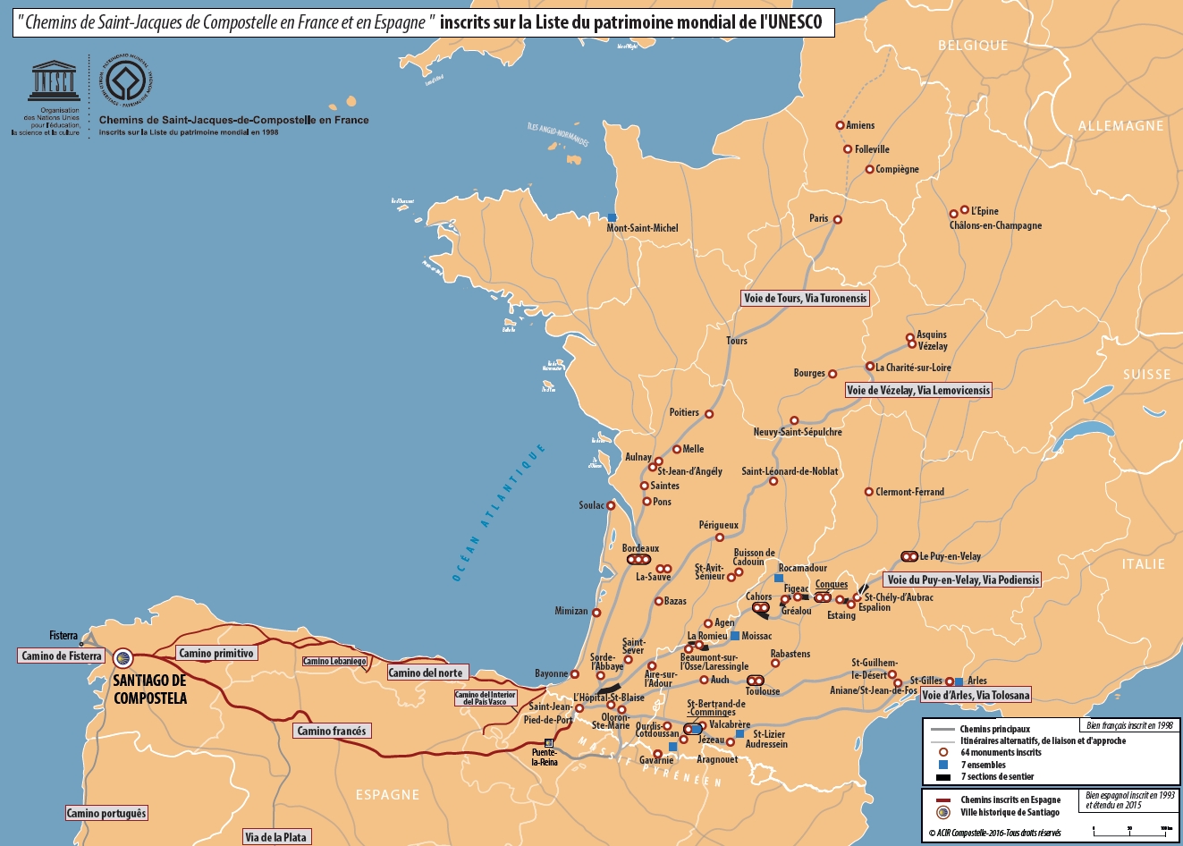 En 1998, l’UNESCO (Organisation des Nations Unies pour l’Éducation, la Science et la Culture) inscrit sur la Liste du patrimoine mondial les « Chemins de Saint-Jacques-de-Compostelle en France ». À ce titre ont été inscrits des monuments qui illustrent la pratique du pèlerinage, constituée de dévotions, de sanctuaires, de routes et de lieux d’accueil, et qui symbolisent le rôle essentiel de cette route de pèlerinage dans les échanges et le développement religieux et culturel, notamment au cours du Moyen Âge.
