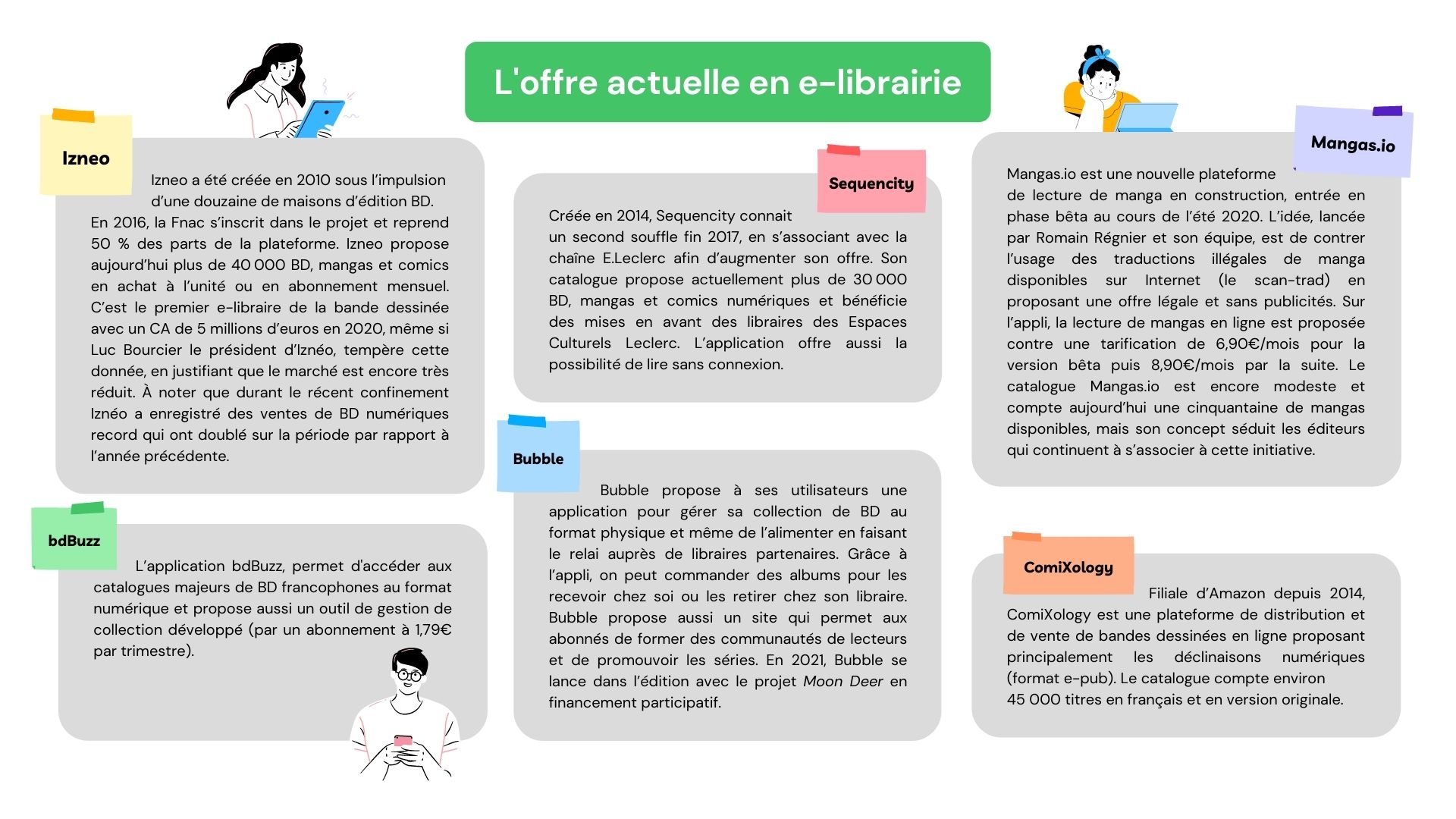 Une librairie numérique (ou e-librairie) désigne un site web marchand ou une application mobile qui permet l’acquisition d’un livre numérique ou physique. La plupart des e-librairies proposent l’achat unitaire et quelques-unes ont lancées des offres d’abonnement comme YouScribe ou Iznéo. Bien que le marché de la bande dessinée numérique reste à l’heure actuelle une niche éditoriale, les acteurs de l’e-librairie rivalisent d’initiatives et de propositions d’abonnements avantageuses afin de recruter de nouveaux usagers. Voici un panorama non exhaustif des principaux e-libraires spécialisés sur le segment de la bande dessinée.