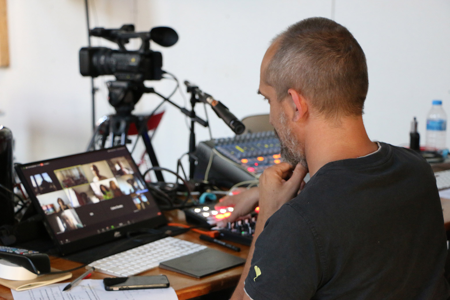 L’enjeu du dispositif était d’assurer une continuité entre deux lieux recevant du public et un ensemble de participants en ligne, soit trois « lieux » aux réalités très différentes en termes de qualité de connexion et de qualité de… présence. La notion de rencontre, par ailleurs, imposait une réalisation en direct. Pour sortir de la désormais habituelle image tronquée des visio-conférences, le dispositif comprenait sept caméras, connectées soit en HDMI ou via un extendeur HDMI sur Ethernet, soit directement par le réseau en utilisant le protocole NewTek NDI. La performance de Marianne Vieulès a elle-même été transmise via le réseau vers l’ordinateur maître (en WiFi cette fois) car nous ne sommes pas parvenus à faire entrer sa sortie HDMI dans le Blackmagic ATEM Mini de l’ordinateur.