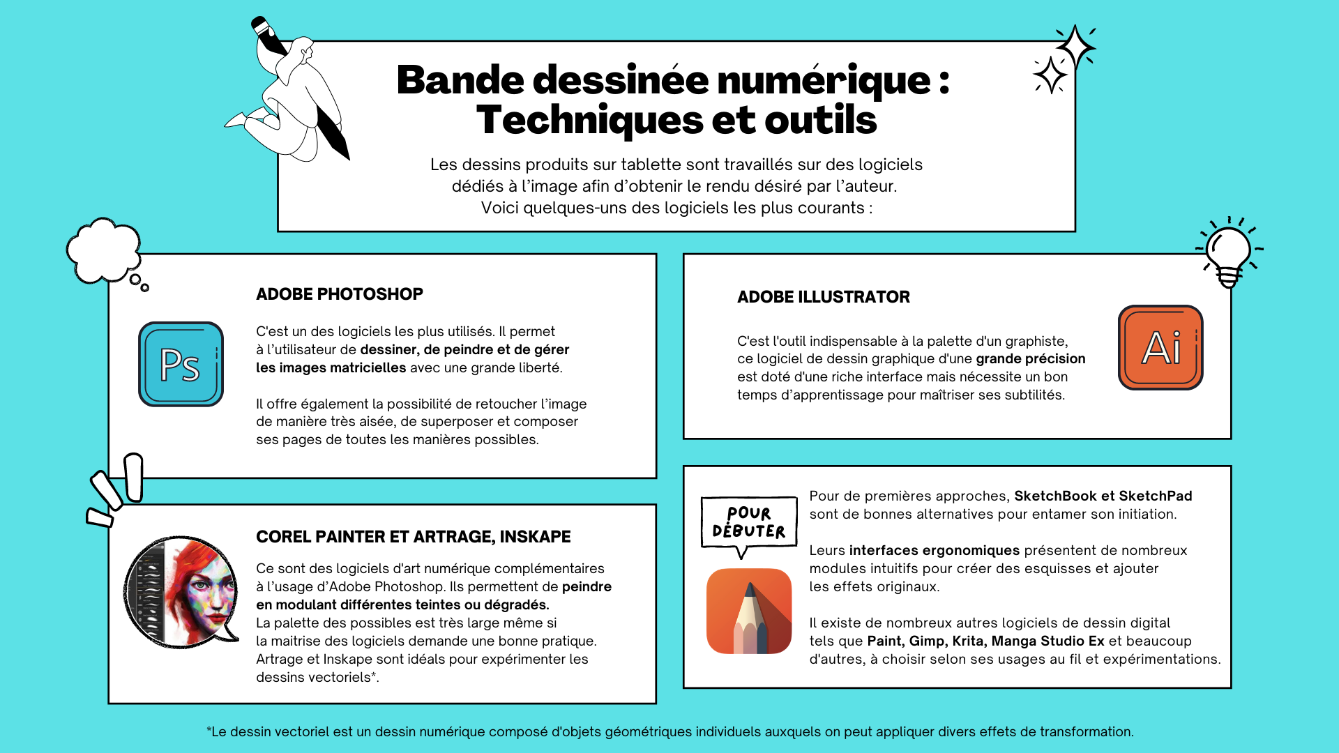 Malgré des débuts difficilement convaincants (à cause d’un rendu graphique polygonal jugé assez grossier à l’époque), les procédés s’améliorent dans les années 80 et l’utilisation des outils informatiques permet plus de détails et de subtilités. De la colorisation au lettrage, des retouches au pixel près, les logiciels de création graphique tels que Photoshop ou Paint ont apporté des solutions fluides à des taches parfois laborieuses. 20 ans plus tard, une majorité de titres publiés sont conçus avec des outils numériques sans que le lecteur ne le remarque. De nombreux auteurs, illustrateurs et coloristes utilisent des tablettes graphiques pour réaliser entièrement ou seulement une partie des étapes de leur création. À ce titre, beaucoup de professionnels recommandent les tablettes graphiques de la marque Wacom (la gamme Cintiq notamment) ou les tablettes à surface interactives de Gaomon (voire les écrans d’Ipad pour des alternatives moins onéreuses).