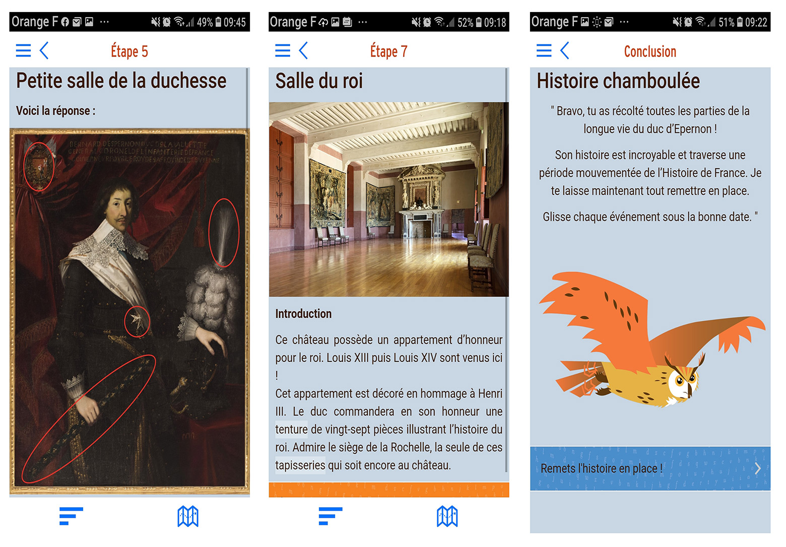 Dès le lancement du parcours, nous découvrons notre mission : retisser les fils de l’histoire du duc d’Épernon pour que le château puisse être construit. Nous nous lançons dans notre quête en suivant le hibou à travers les différentes pièces du château. La navigation sur l’appli est simple et ergonomique ; seul bémol, les vidéos s’affichent en très petit format. Les pièces se succèdent avec à chaque fois une explication sur l’histoire de la famille du duc, du château ou du mobilier puis un jeu qui nécessite d’observer ce qui nous entoure. Parmi ces jeux, on nous propose de retrouver les différences entre l’aile gauche et l’aile droite du château, les différences entre l’image qui s’affiche à l’écran et le tableau ou la tapisserie que nous avons devant les yeux, retrouver un élément affiché à l’écran dans la pièce ou encore de répondre à des questions sur le contexte historique lu précédemment.