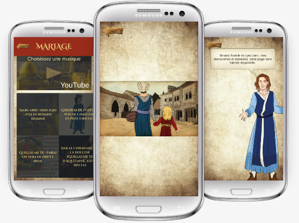 L’idée est donc d’amener les publics scolaires à se rendre sur Les Voies d’Aliénor en consultant des supports médiatiques en classe (des cartes personnages, des podcasts, des vidéos sur des moments de sa vie, etc.) mais aussi en se déplaçant sur des sites de proximité à partir, par exemple, d’une cartographie qui s’enrichit progressivement. L’ensemble de ces médias sont centralisés grâce au site Internet qui renvoie également vers des ressources externes, à l’image des expositions virtuelles de la BnF, et qui propose ainsi une histoire fragmentée qui se déploie sur différents supports médiatiques, selon le principe du transmedia storytelling. »