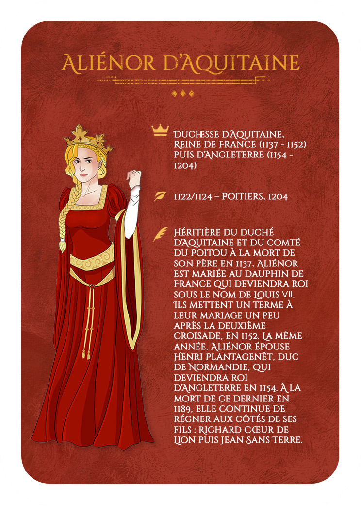 Enfin, un kit de bienvenue (non numérique) met à la disposition des publics scolaires une carte de la Nouvelle-Aquitaine, un arbre généalogique et un set de cartes représentant les personnages marquants du destin d’Aliénor. Un spectacle a même été intégré à ce projet : Le Testament d’Aliénor (Katy Bernard, co-auteure du spectacle, fait partie de l’équipe projet).