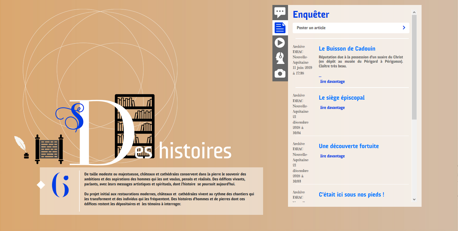 Initié en 2015 par Cap Sciences, Centre de Culture Scientifique, Technique & Industrielle (CCSTI) à Bordeaux en lien avec la DRAC Nouvelle-Aquitaine et la DAAC du Rectorat, le projet Enquête sur le patrimoine médiéval ! (anciennement intitulé Cathédrale numérique) est destiné aux élèves et aux enseignants du second degré. Il a pour objectif, durant l’année scolaire, de les accompagner dans la découverte du patrimoine médiéval de la région et des différents métiers liés à sa restauration. Cette découverte des monuments s’appuie, notamment, sur les dossiers de restauration numérisés des cathédrales d’Aquitaine telles que St-Jean-Baptiste d’Aire-sur-Adour et Saint-Caprais d’Agen (seules cathédrales d’Aquitaine dont les programmes de restauration sont à ce jour terminés). Ce corpus documentaire a été depuis étendu à d’autres monuments civils et religieux de la région et a l’ambition d’être enrichi par les contributions des élèves dans le cadre d’un projet pédagogique dont Cap Sciences est la clé de voûte : il œuvre ainsi à la formation des enseignants et accompagne des ateliers d’écriture web pour les élèves.