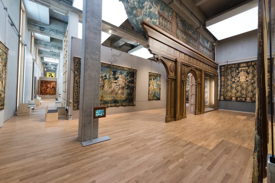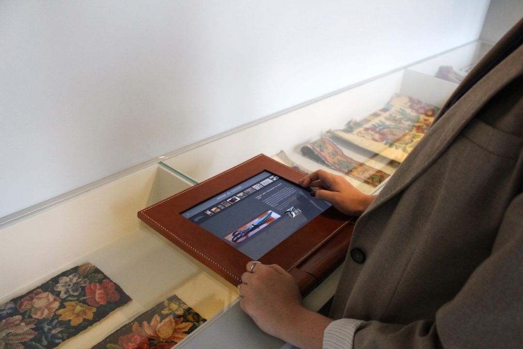 Par ailleurs, dans la Nef des tentures, espace phare du parcours d’exposition où cinq siècles et demi de production en tapisserie d’Aubusson sont présentées, 6 tablettes multimédia, en complément d’un guide de visite distribué à l’entrée du musée, sont à disposition des visiteurs. Elles leur permettent de plonger dans les détails des œuvres et zoomer sur la composition de différentes tapisseries pour mieux appréhender le rendu, les savoir-faire et les techniques de tissages pluriséculaires de la tapisserie d’Aubusson : taille du point, dégradés de couleurs, laine… Sans action du visiteur, les tablettes remplissent le rôle d’un cartel conventionnel affichant ainsi un lent panoramique de la tapisserie, de son titre et de son auteur.