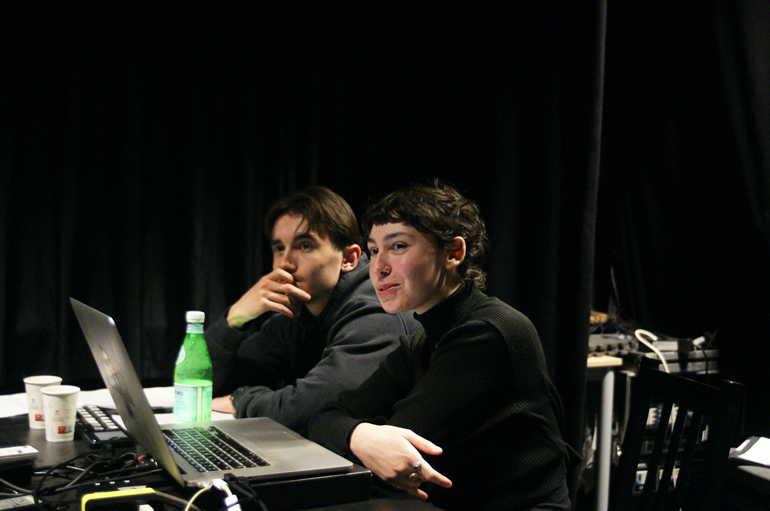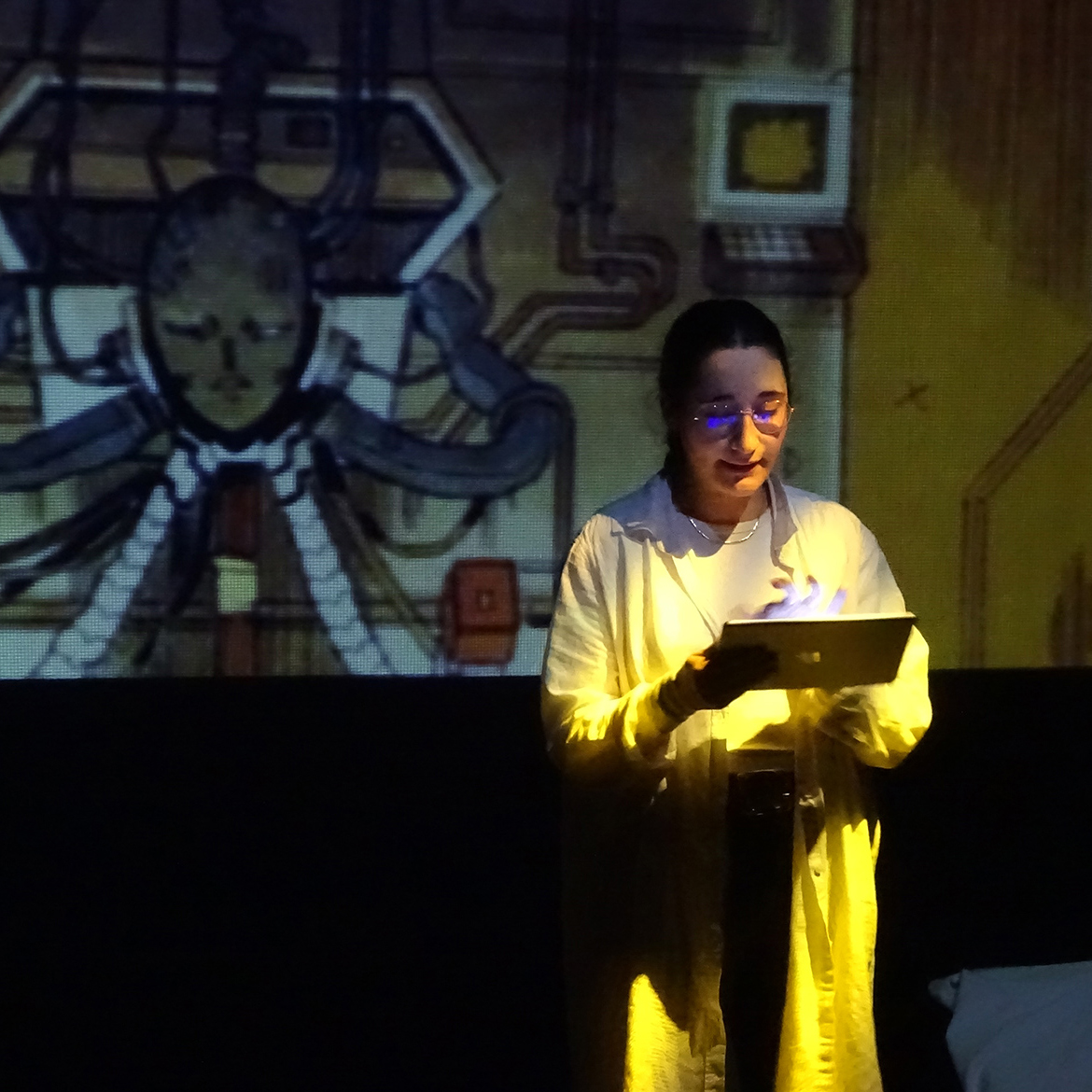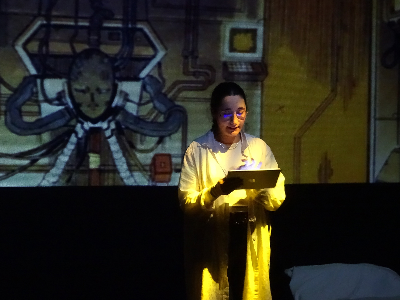 Pour ce faire, les étudiants ont travaillé à partir de deux scènes qu’ils ont réunies au sein de cette forme théâtrale où ils mettent en scène deux personnages : Carbone et Noriko. Ils sont restés fidèles au texte présent dans la bande dessinée. L’œuvre expose un monde très sectaire, la population est séparée par genre, par sexualité, par nature : une partie humaine et une partie robotique. Pour représenter cette distinction, ils ont utilisé le dispositif technique et artistique de la vidéoprojection pour simuler le corps de Carbone (corps robotique), allongé sur un lit, pendant que Noriko fait part du travail scientifique mené pour créer Carbone.