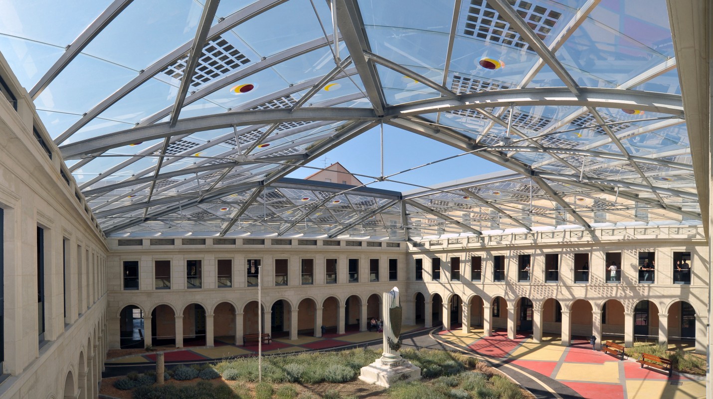La rénovation du lycée Bertrand-de-Born de Périgueux, en 2011, comprend l’installation d’une verrière photovoltaïque au-dessus de l’ancien cloître. © Région Nouvelle-Aquitaine, Jean-Pierre Bost.
