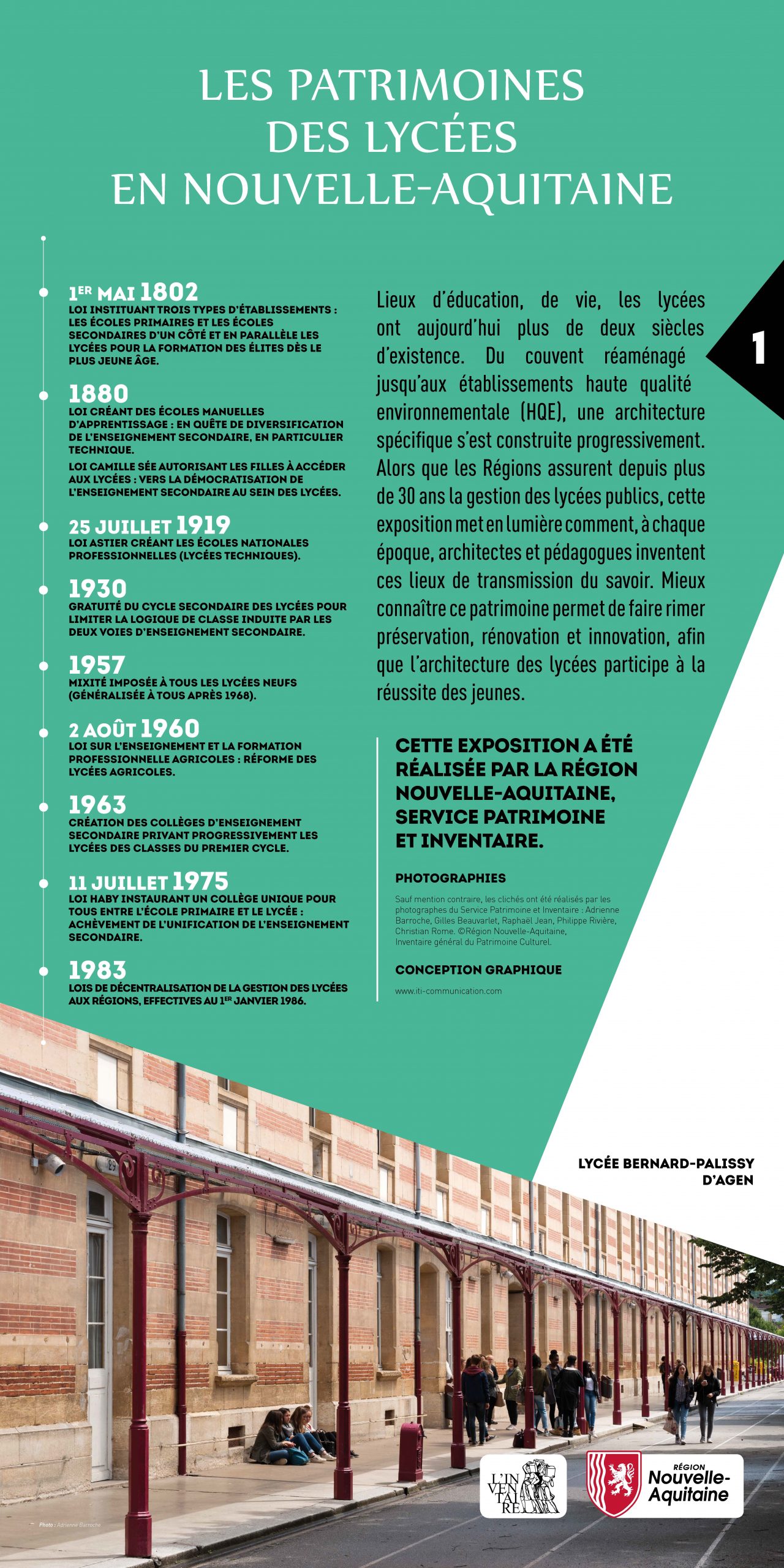 Les 300 lycées de Nouvelle-Aquitaine, qui accueillent aujourd’hui 200 000 élèves, présentent un intérêt patrimonial souvent méconnu. Cette exposition, réalisée par les services Patrimoine et Inventaire de la Région, a pour objectif de faire découvrir la richesse et la variété des patrimoines de ces lycées.