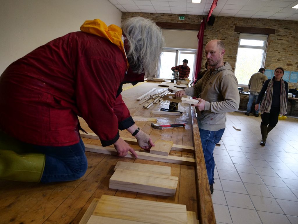 Projet Nos Cabanes © William Windrestin / visuel de deux personnes en premier plan qui mesurent et découpent du bois