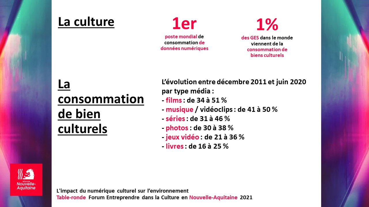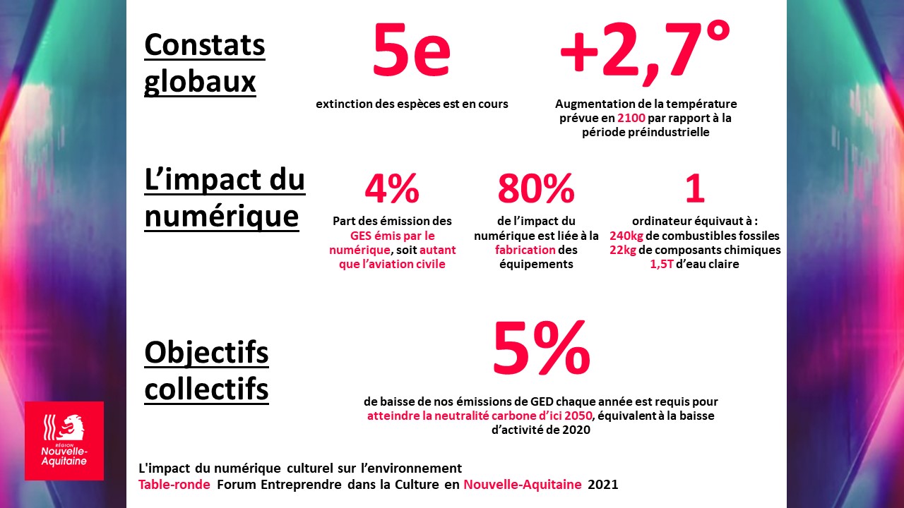 Au sein du Forum Entreprendre dans la Culture en Nouvelle-Aquitaine 2021 organisé par l’A. Agence culturelle Nouvelle-Aquitaine, a été mise en place une table-ronde conçue par la Région Nouvelle-Aquitaine autour du thème : « L’impact du numérique culturel sur l’environnement : état des lieux et solutions alternatives pour un usage plus écoresponsable ».